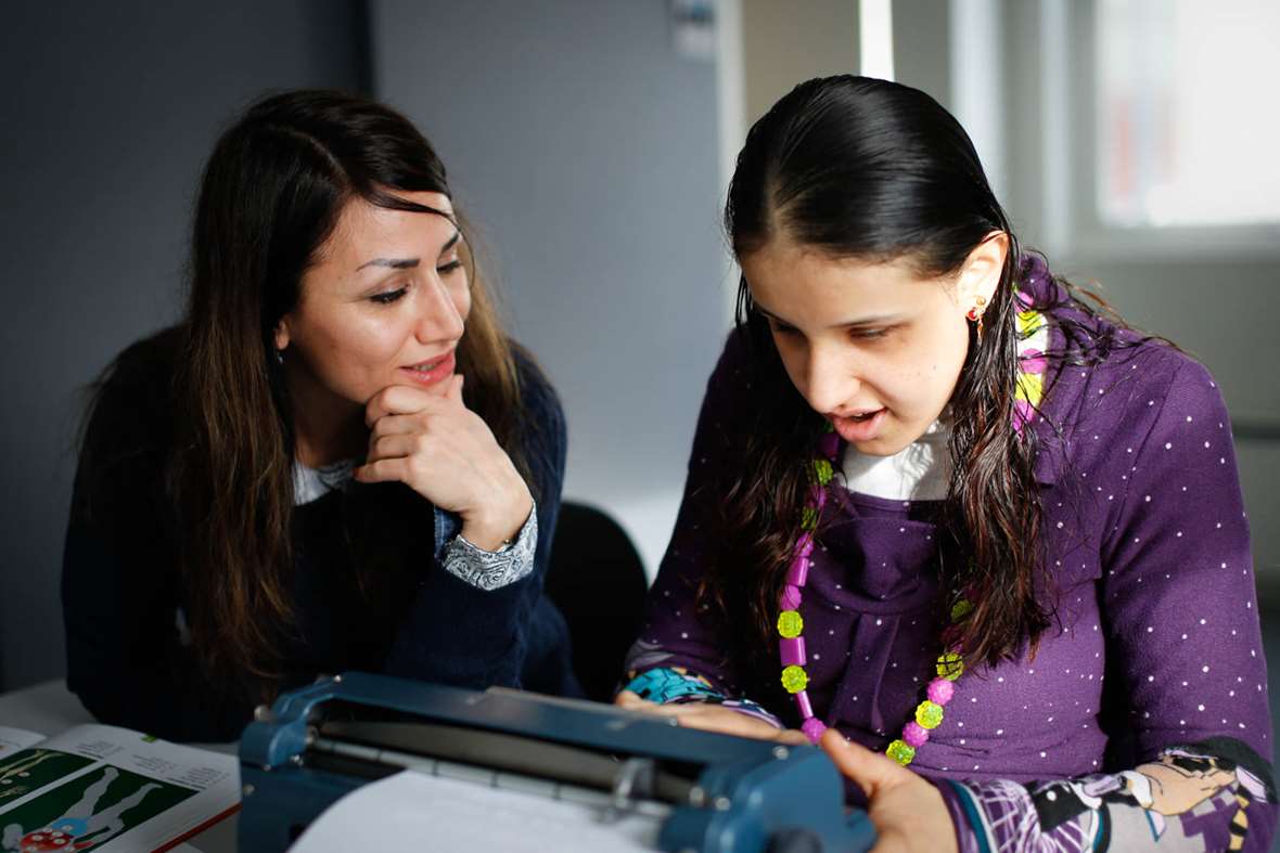 Fereshteh og Rahma sitter side om side. Fereshteh sier ord om kroppen mens Rahma skriver dem på punktmaskinen.